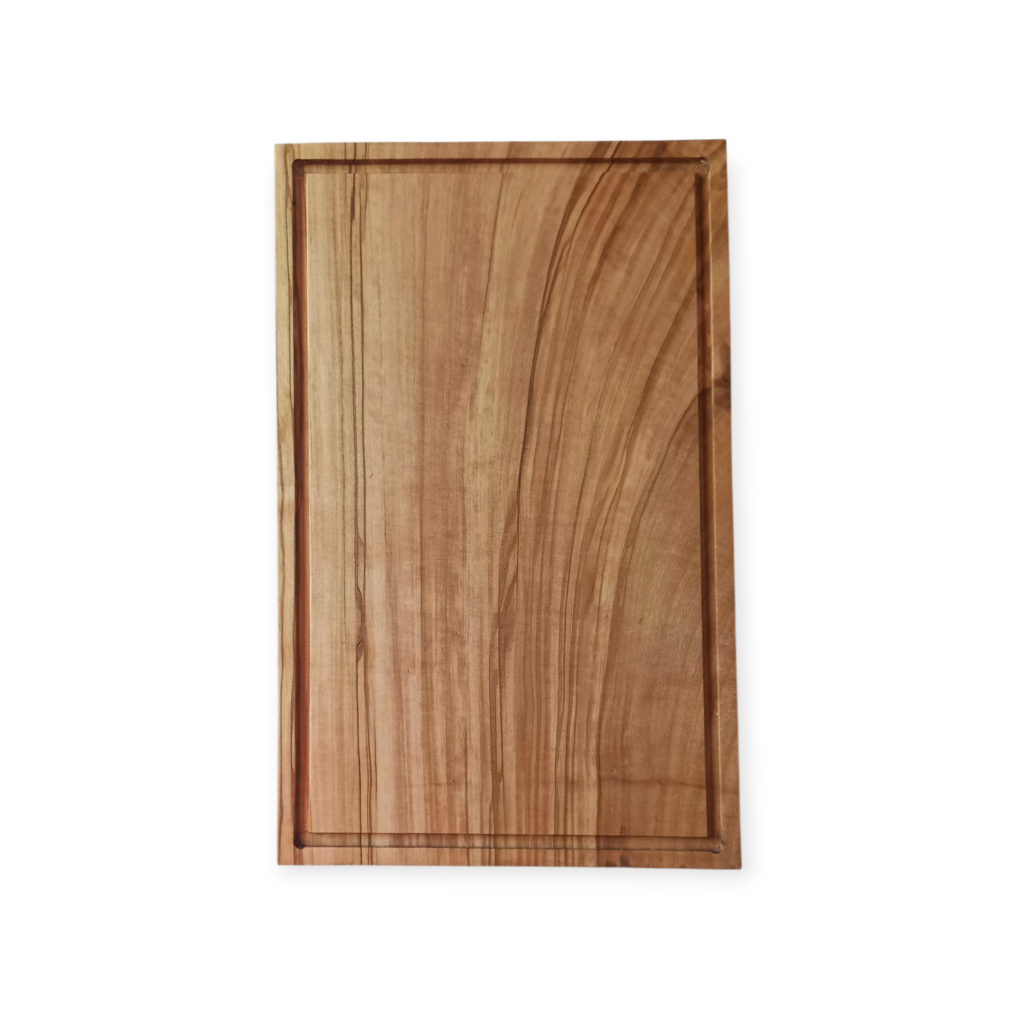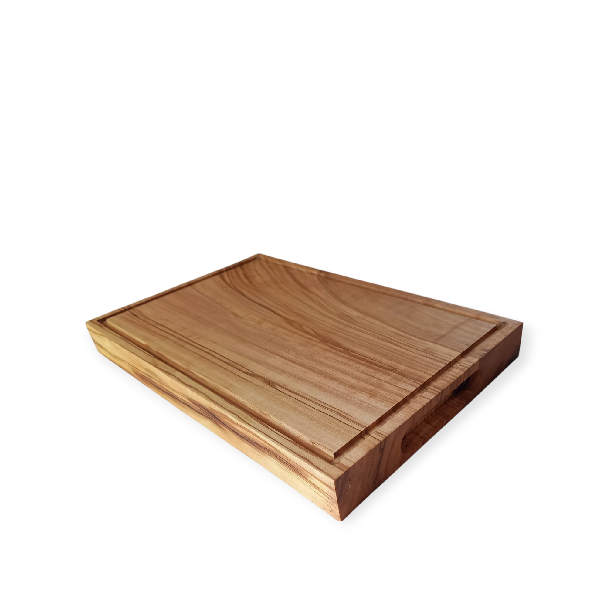 Tabla de madera de Olivo con surcos para la contención de jugos y agarraderas laterales para un mejor traslado de la misma, medidas: 33x21x3,5 cm.