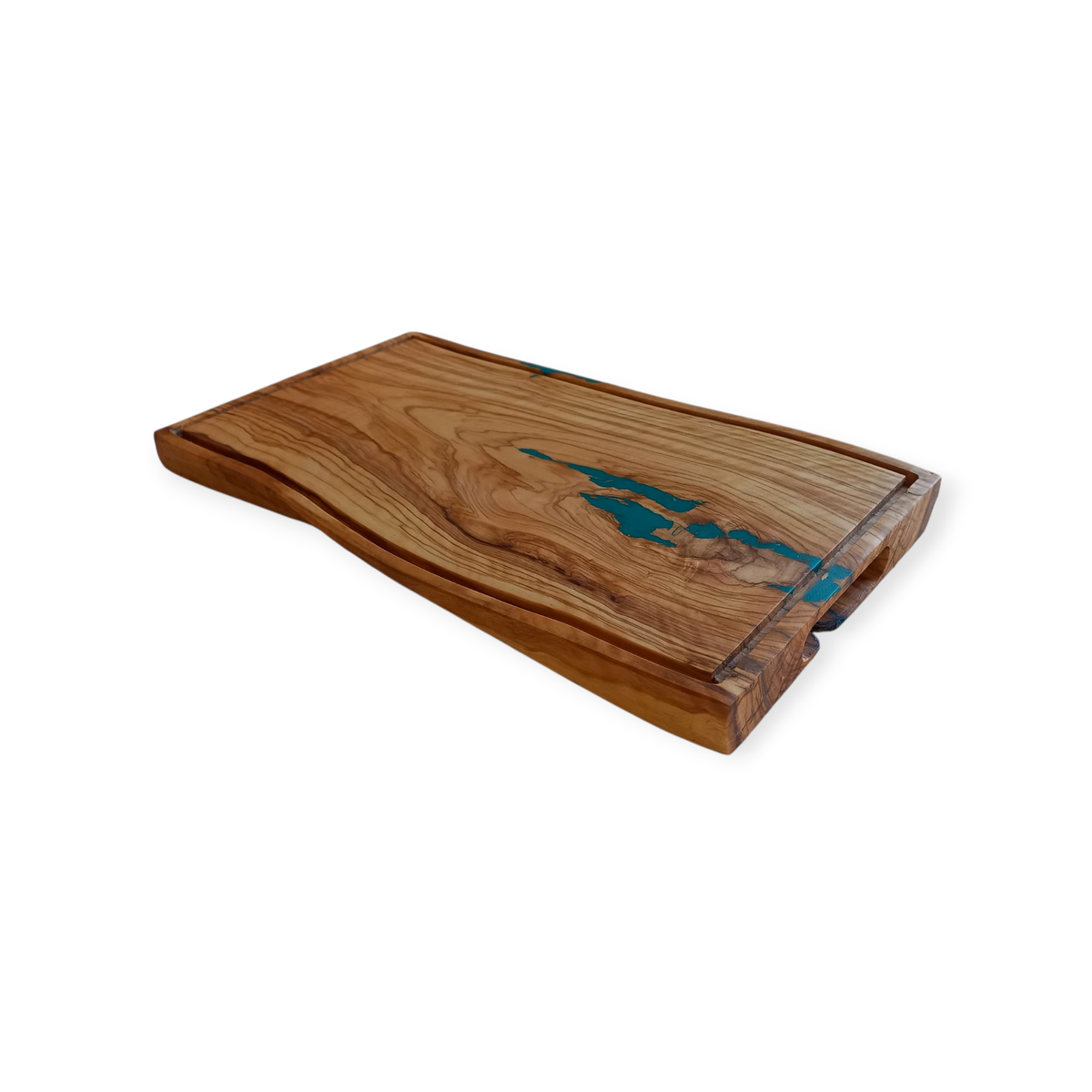 Tabla rústica y artesanal de madera de Olivo con detalles en resina epoxi, medidas: