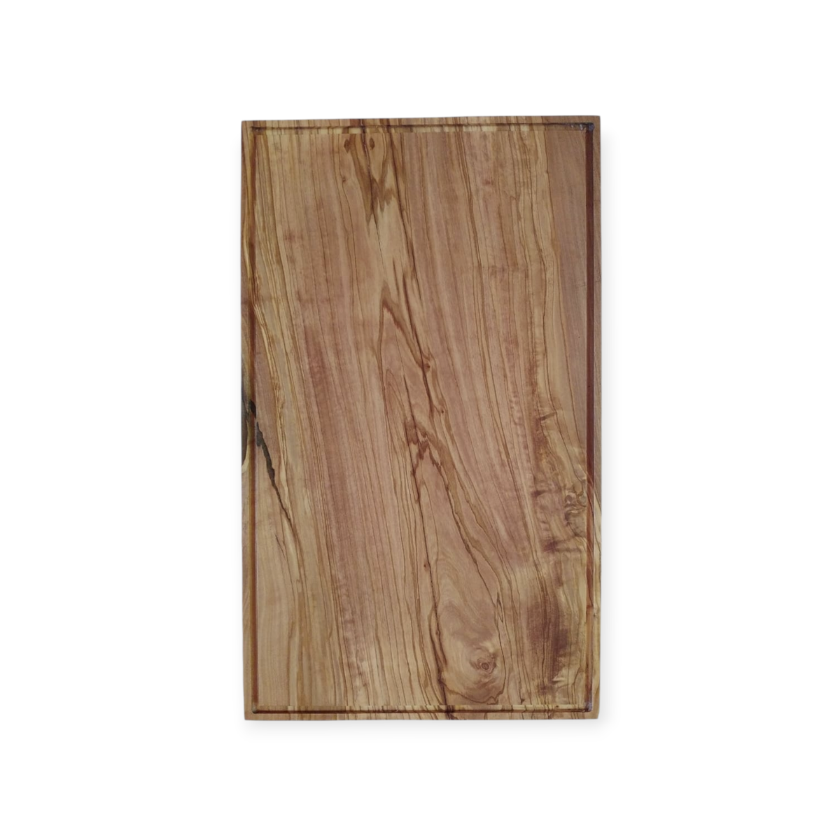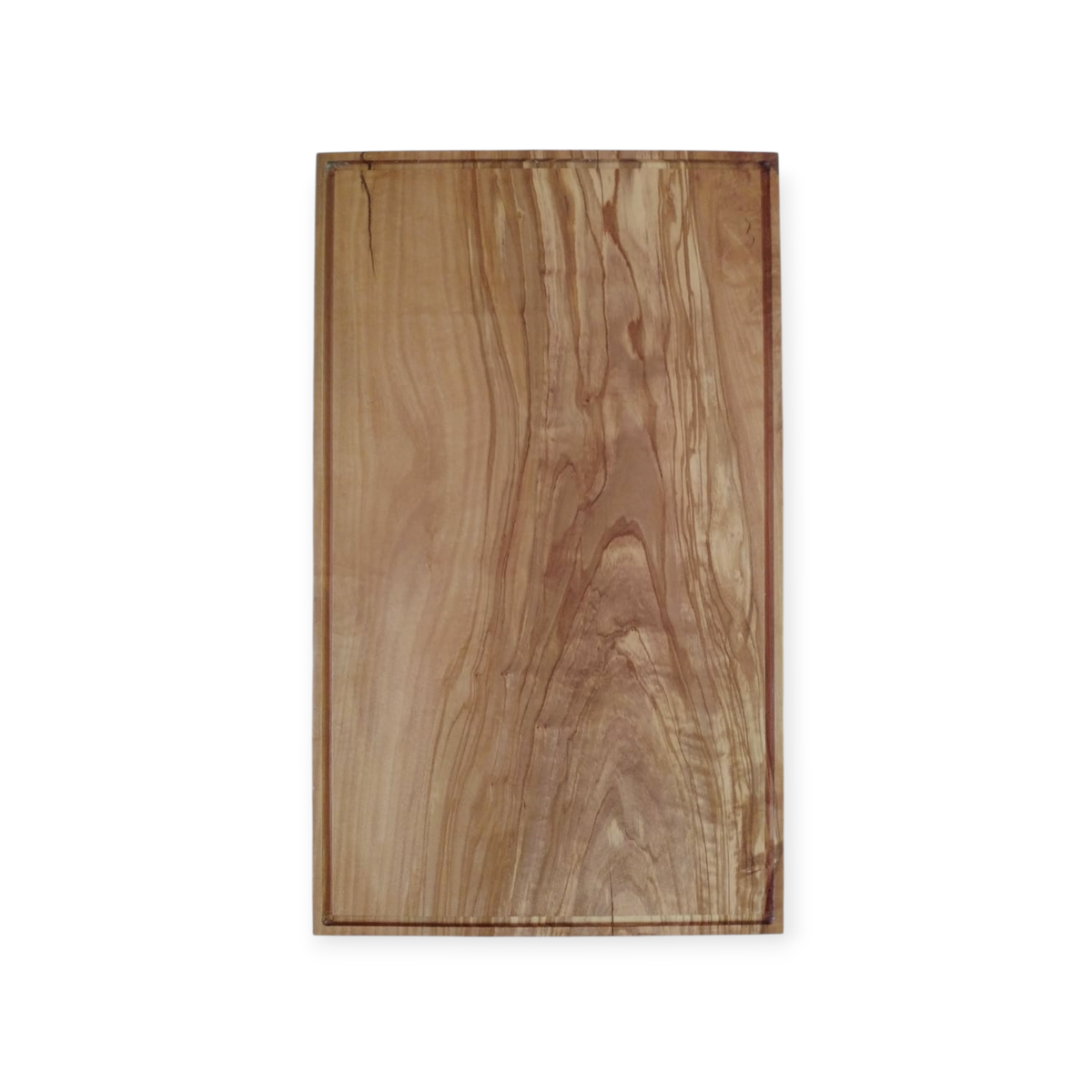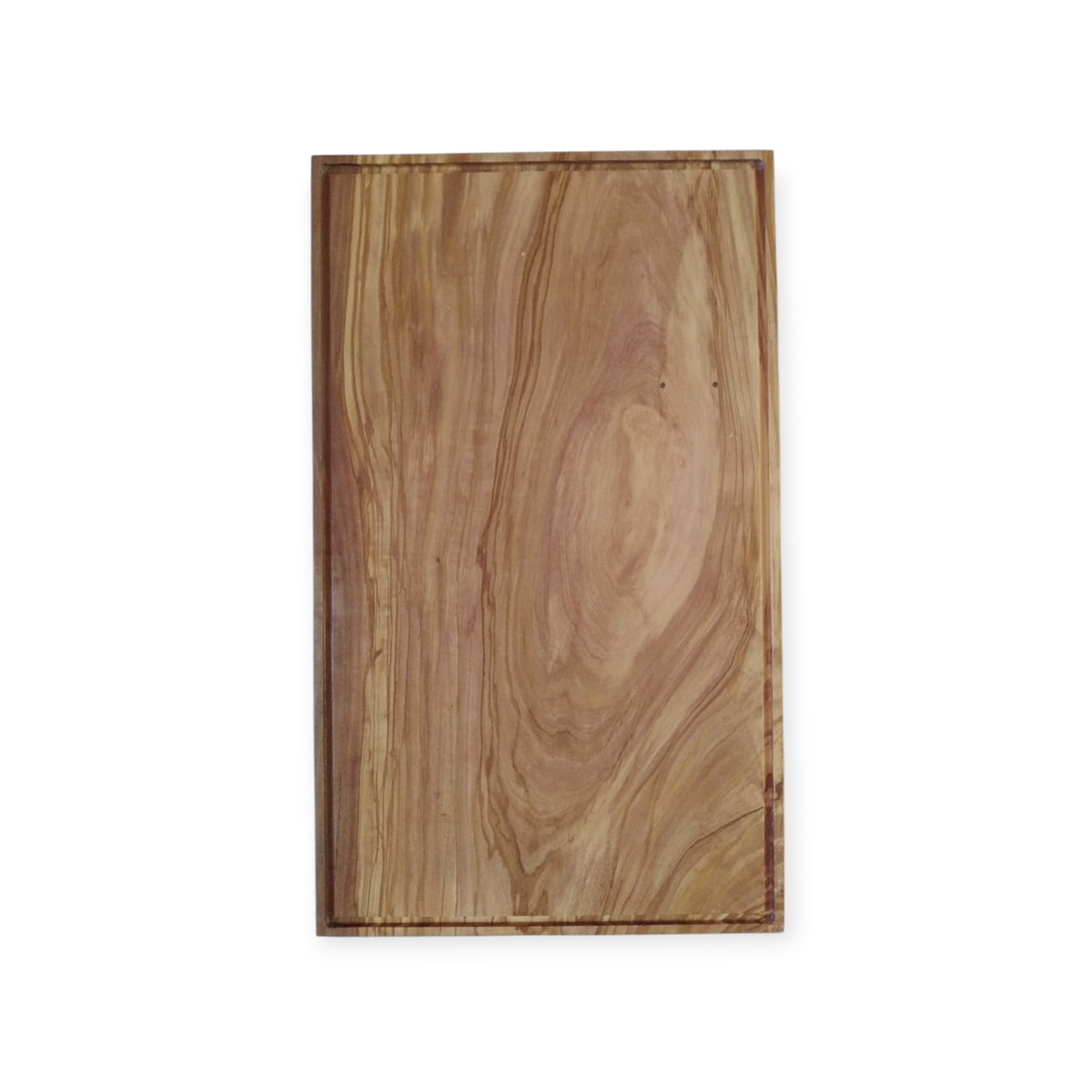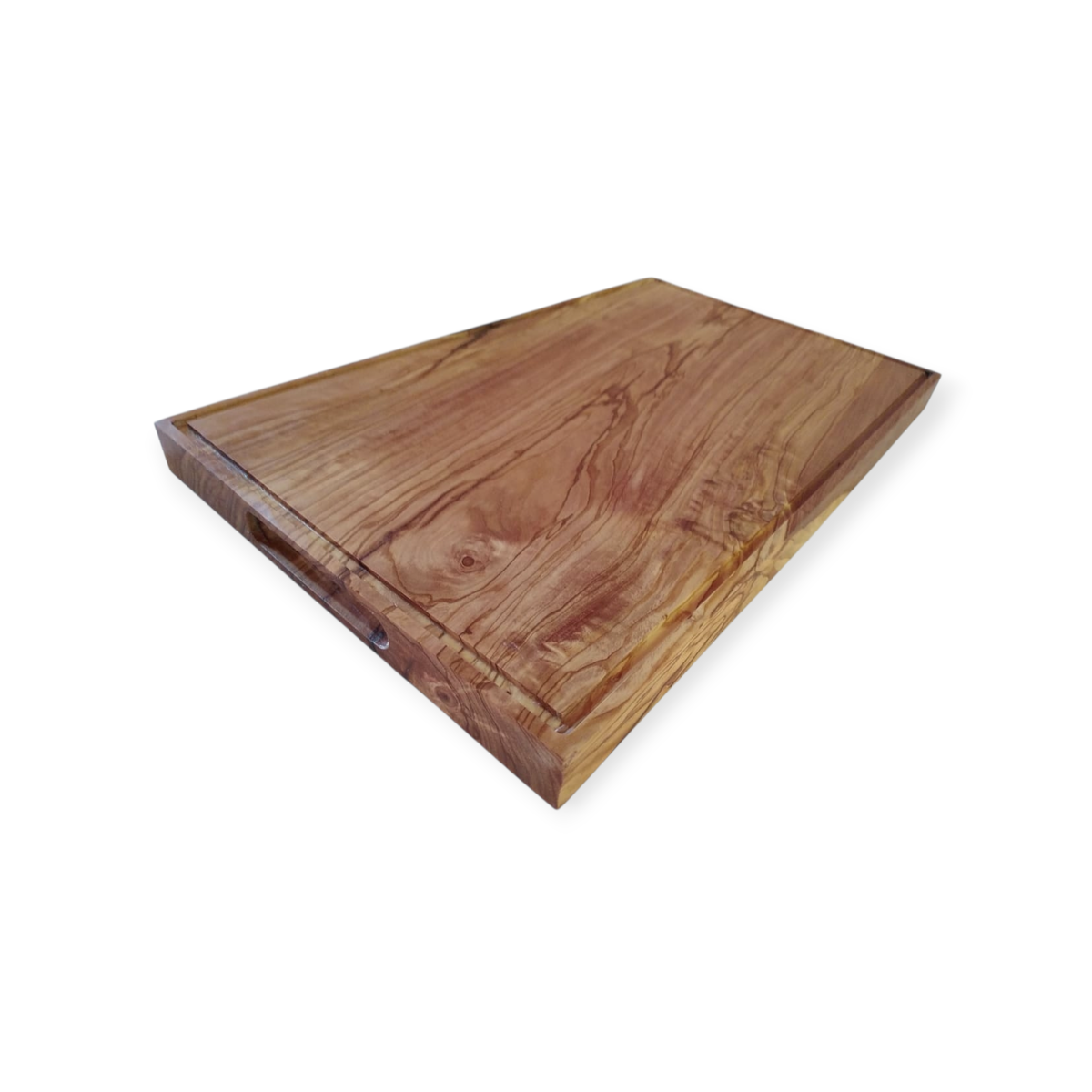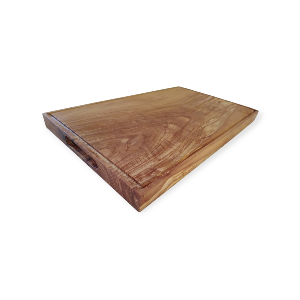 Tabla de madera de Olivo con surcos para la contención de jugos y agarraderas laterales para un mejor traslado de la misma, medidas: 50x30x3,5 cm.